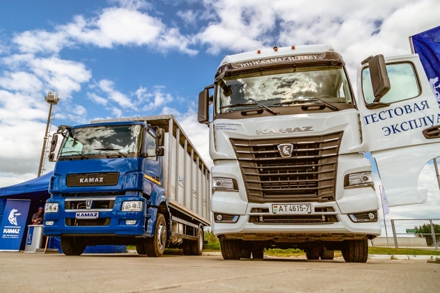 На стенде ОДО «ВТК КАМАЗавто» презентованы бортовой автомобиль для перевозки крупнорогатого скота на шасси КАМАЗ-5325 и флагман линейки К5 – седельный тягач КАМАЗ-54901.